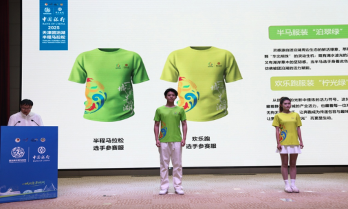 发布会现场,全新设计的赛事奖牌和服装公布。奖牌设计主题为“时光沙漏,生生不息”,整体图案为绿色沙漏,形似一棵大树的根系;内部流沙采用了与赛服呼应的“泊翠绿”,象征着团泊湖马拉松赛事生生不息,更寓意着静海体育事业、团泊湖畔的大健康产业生机盎然。奖牌内嵌NFC芯片,参赛选手可以通过手机NFC识别功能永久保存完赛证书,还可以识别完赛成绩,做到一人一牌一成绩。半马服装为“泊翠绿”,萃取了团泊湖的灵动生机,既有湖水波光的透亮感,又有湖岸草木的坚韧感。欢乐跑服装“柠光绿”,藏着团泊健康城的产业活力,也藏着每一位欢乐跑者无拘无束的快乐。身侧,则是以艺术字体呈现2025团泊湖半程马拉松的“一城风景半城湖”口号和Logo。选手们身着灵动活泼的“泊翠绿”和“柠光绿”,仿佛被团泊湖的活力赋能。