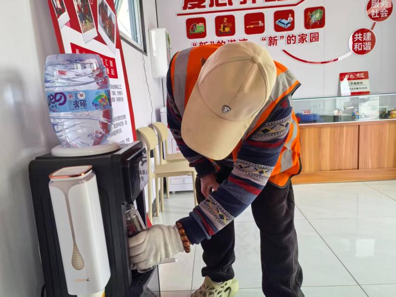 义工“爱心驿站”内,环卫工人、外卖员等户外劳动者可随时进来歇脚、接热水、短暂休息。驿站虽小,直饮机、休息座椅、空调等设施一应俱全,志愿者还会根据季节提供凉茶、热水等暖心物资。常态化服务,体现了城市对劳动者的尊重与关怀。“爱心驿站,每一站都是家”不仅仅是一句标语,更成为户外劳动者实实在在的“温暖港湾”。
