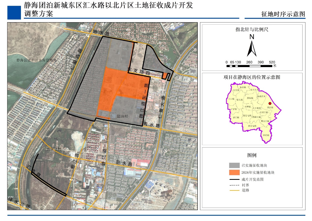 根据2020年1月1日起实施的《中华人民共和国土地管理法》第四十五条规定、自然资源部《土地征收成片开发标准》(自然资规〔2023〕7号)、《天津市土地征收成片开发标准实施细则》(津规资源发〔2024〕1号)和《天津市土地征收成片开发方案编制报批指南》(津规资源发〔2024〕29号)要求,结合静海区发展需要,组织编制了《静海团泊新城东区汇水路以北片区土地征收成片开发调整方案》,(以下简称“《方案》”),现将《方案》核心内容予以公示,主要内容如下: