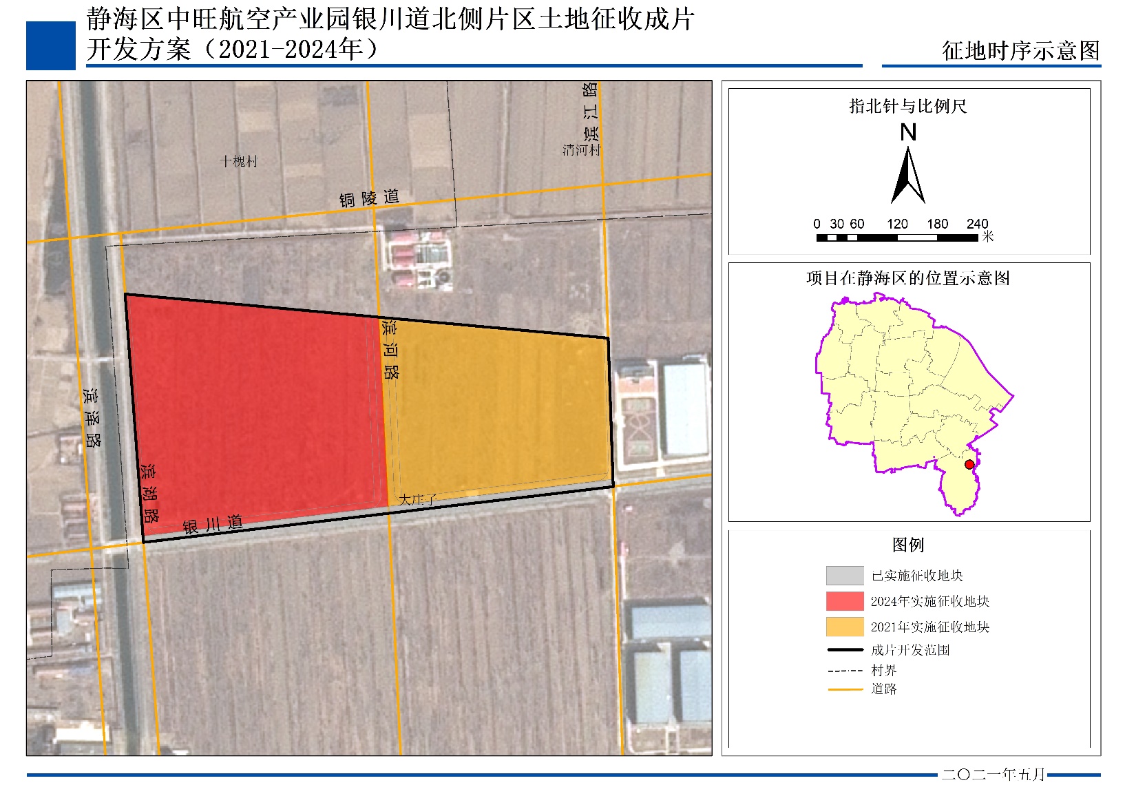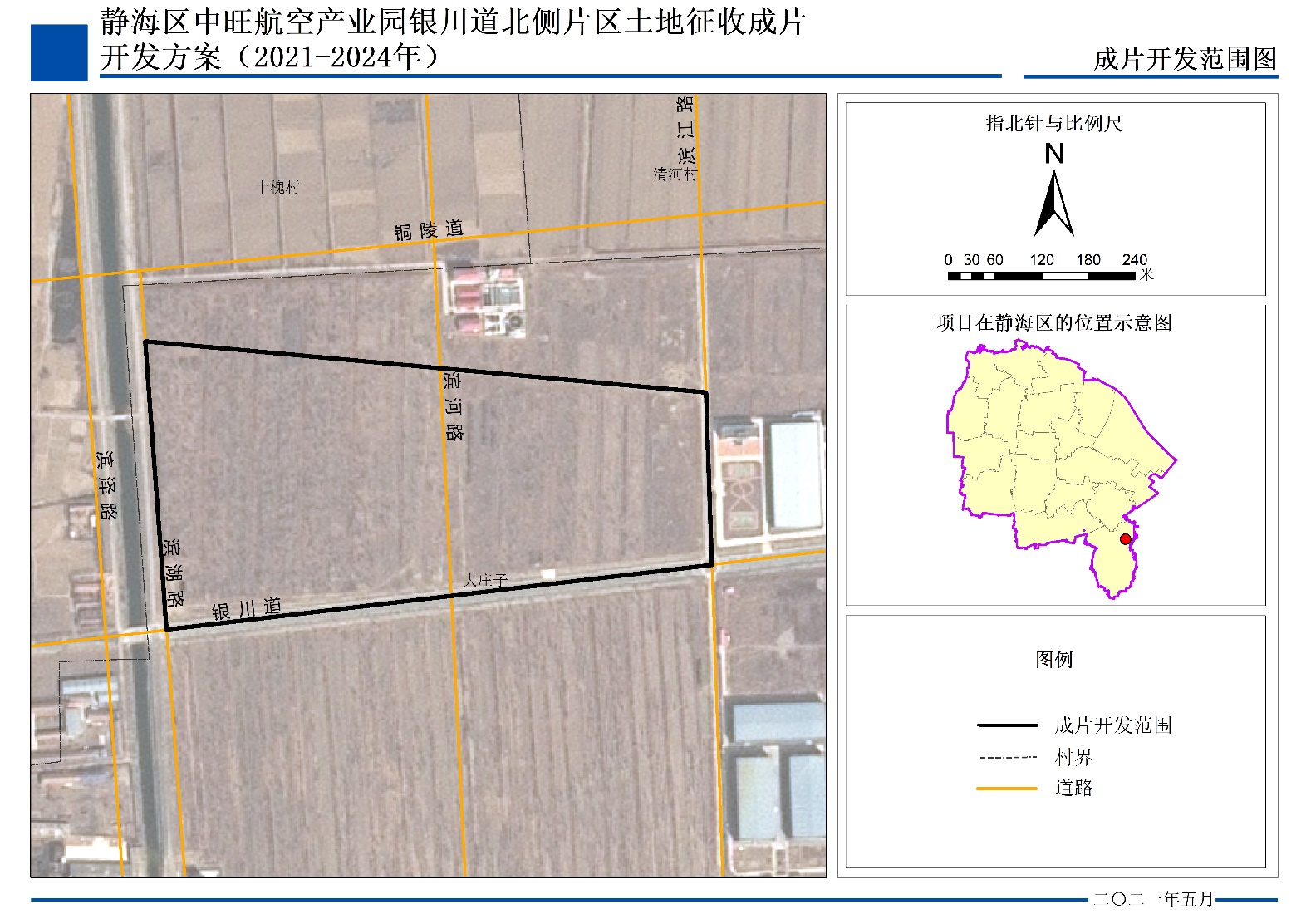 根据2020年1月1日起实施的《中华人民共和国土地管理法》第四十五条规定、自然资源部《土地征收成片开发标准(试行)》(自然资规〔2020〕5号)和《天津市土地征收成片开发标准实施细则(试行)》(津规资源发〔2021〕80号)要求,结合静海区发展需要,组织编制了《静海区中旺航空产业园银川道北侧片区土地征收成片开发方案(2021-2024年)》,(以下简称“《方案》”),现将《方案》主要内容公示如下: