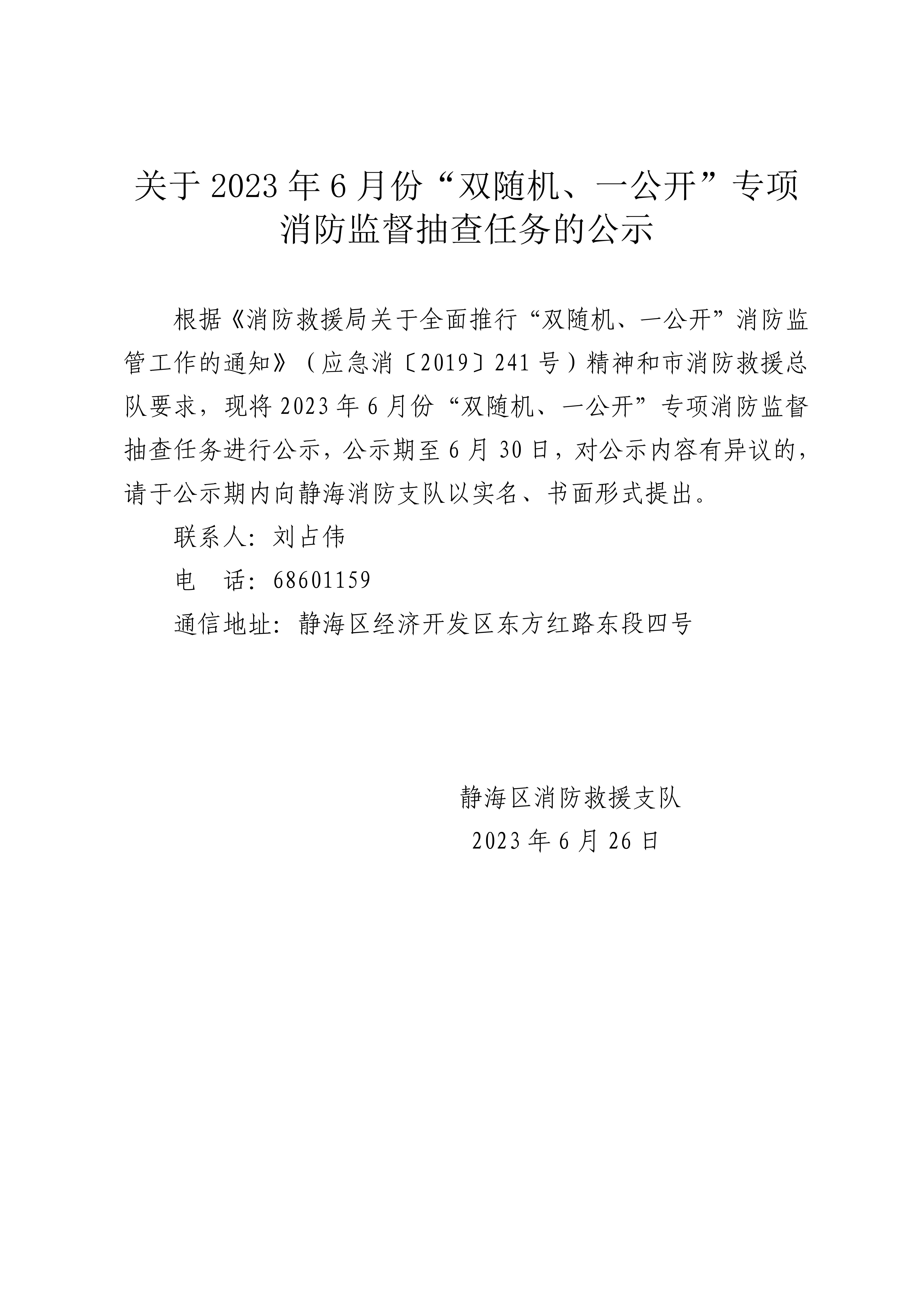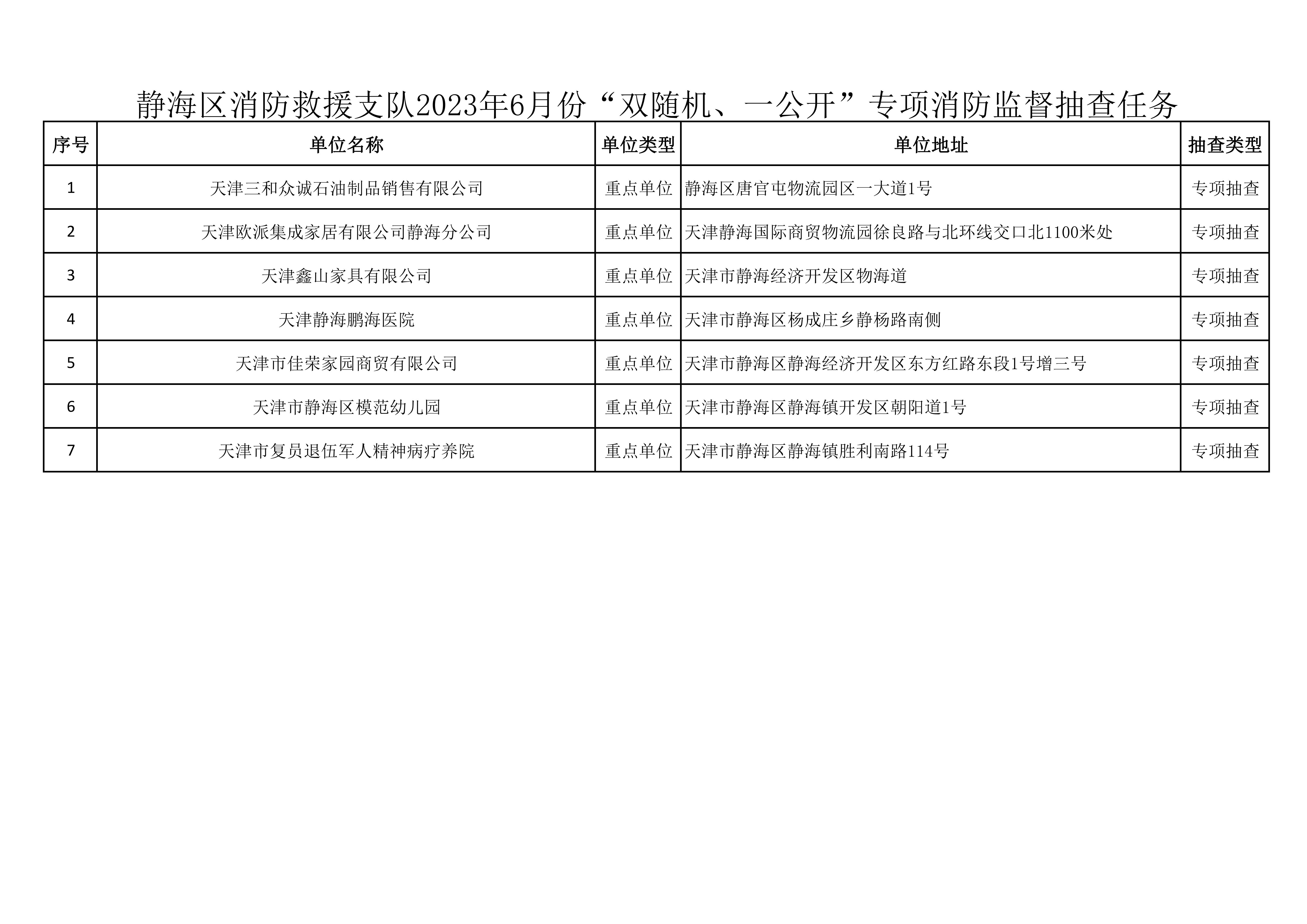 关于6月份“双随机、一公开”专项消防监督抽查任务的公示