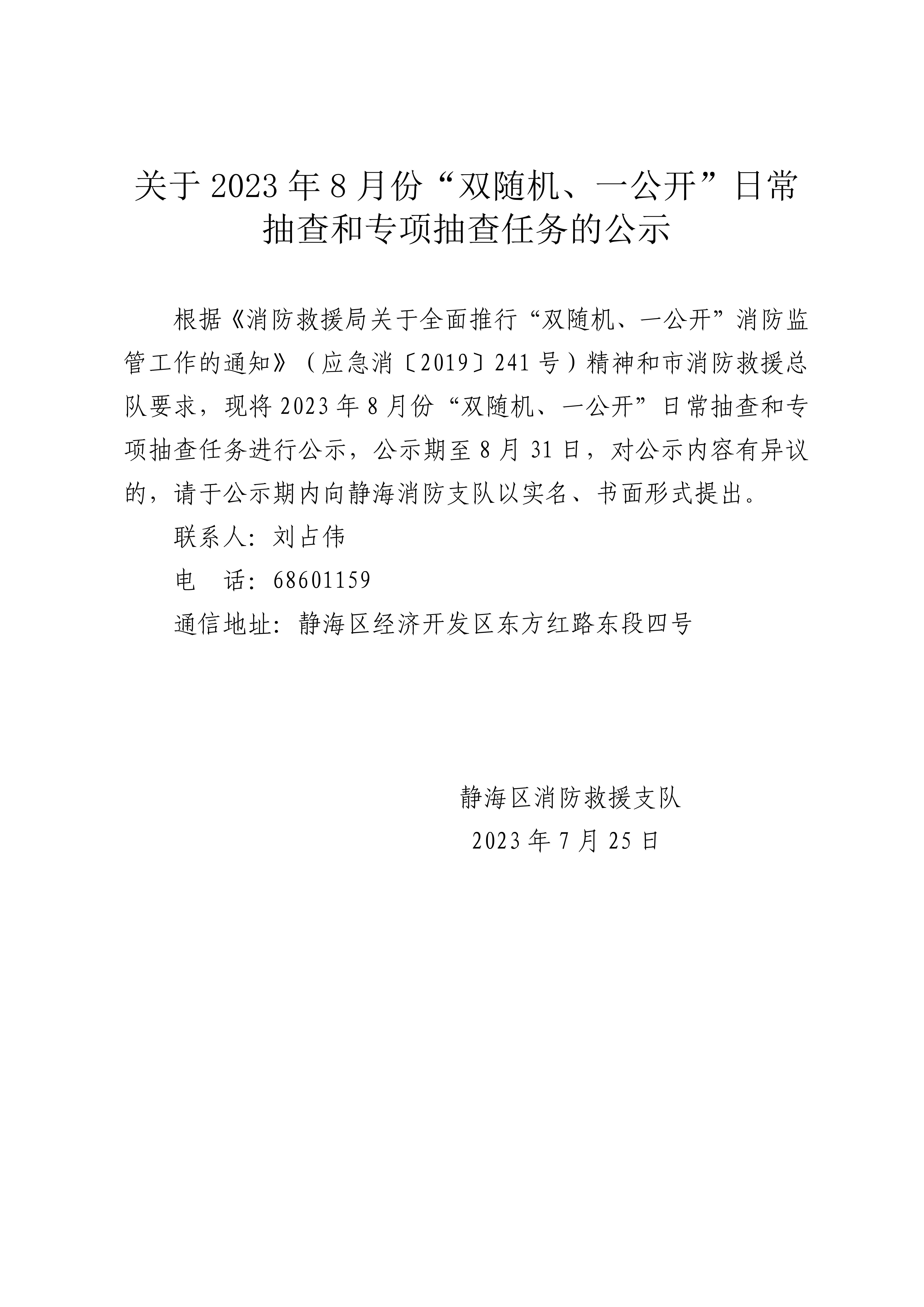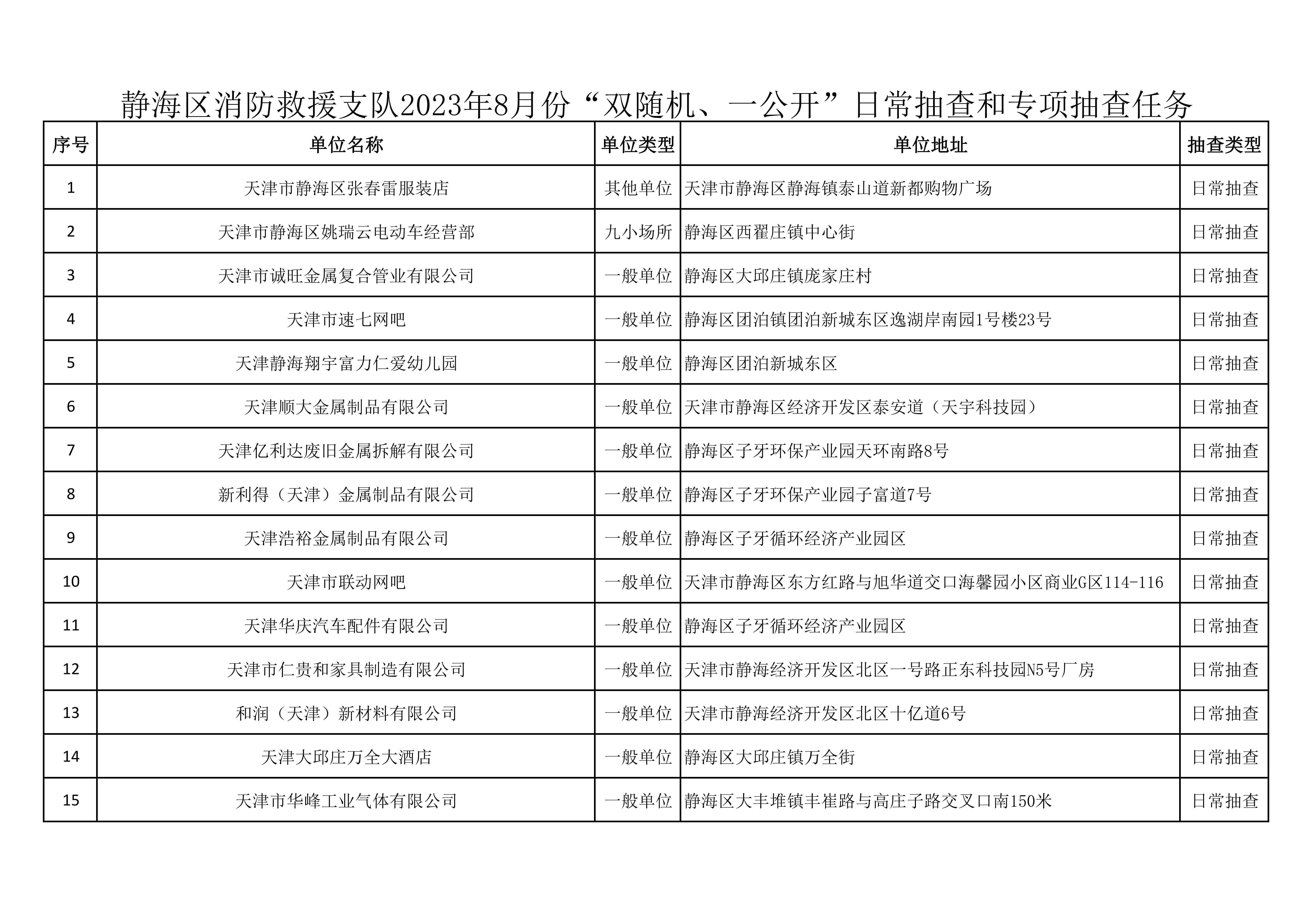 关于8月份“双随机、一公开”消防监督抽查任务的公示