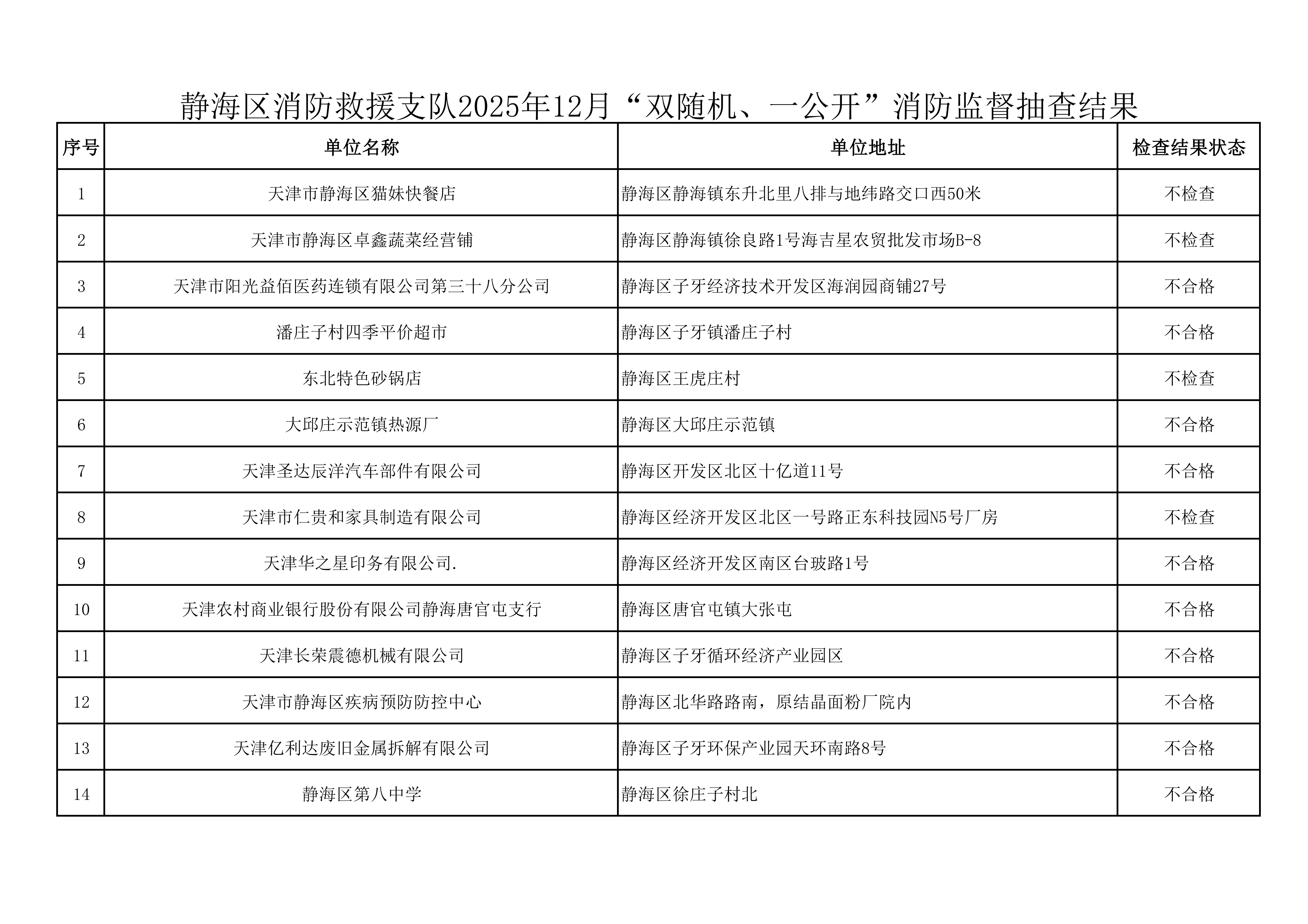 关于12月份“双随机、一公开”消防 监督抽查结果的公示