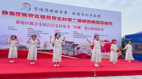 “静海区陈官屯镇吕官屯村第二届栖霞桃园采摘节暨夏季‘村晚’展示展演活动,开幕!”伴随着陈官屯镇吕官屯村党总支书记、村委会主任朱杰的宣布,演出正式开始。