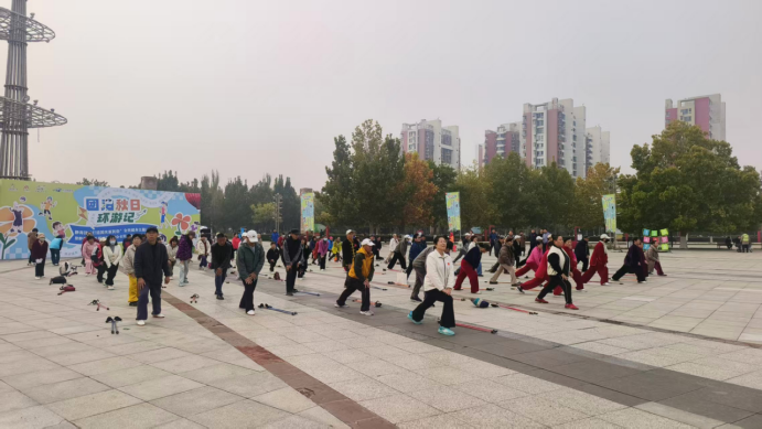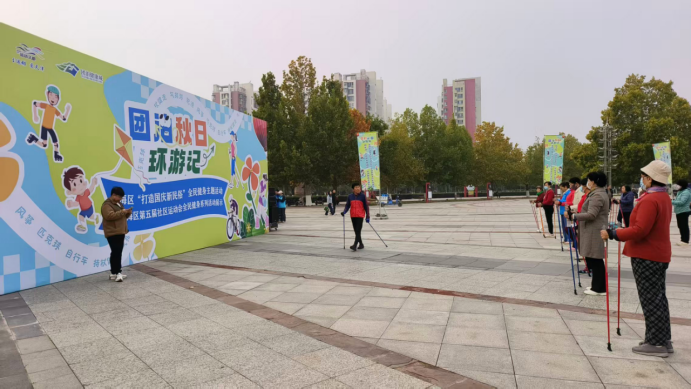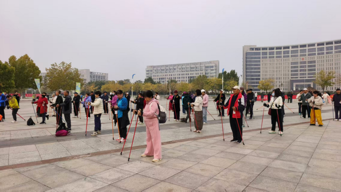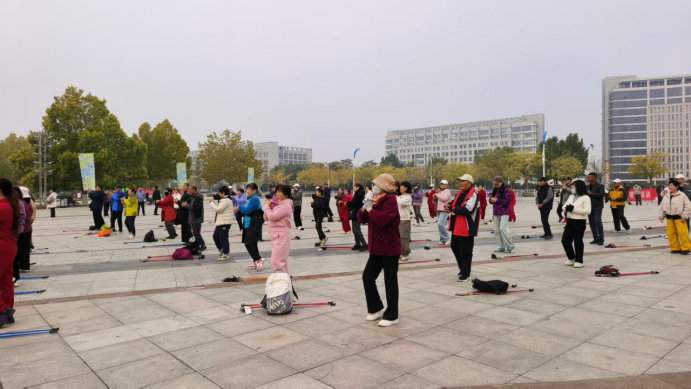 在实操环节,学员们精神饱满、步伐整齐,围绕人民广场开展持杖行走练习,充分展现了天津市老年人积极参与健身、追求健康生活的良好精神风貌。